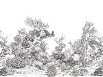 Inspiré des gravures anciennes, en vogue au 19ème siècle, ce dernier esquisse à la manière d’un trompe-l’œil de merveilleux paysages sur les murs de la maison, entre champs de fleurs, savane peuplée d’animaux et panorama sur des sommets enneigés.